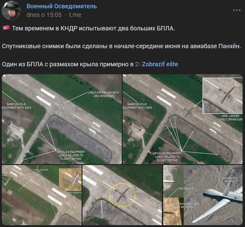 Satelitné snímky boli zhotovené začiatkom-v polovici 06/2023 na leteckej základni Panghyon (방현비행장). Jedno z bezpilotných lietadiel s rozpätím krídel približne 20m sa veľkosťou približuje novému iránskemu lietadlu Shahed-149 "Gaza" a druhé s rozpätím krídel približne 35m sa už veľkosťou približuje americkému lietadlu RQ-4 "Global Hawk". Zdroj https://vk.com/wall-123538639_3684895 / https://t.me/ImpNavigator/5207 z 17.06.2023 + 5 kvalitnejších foto