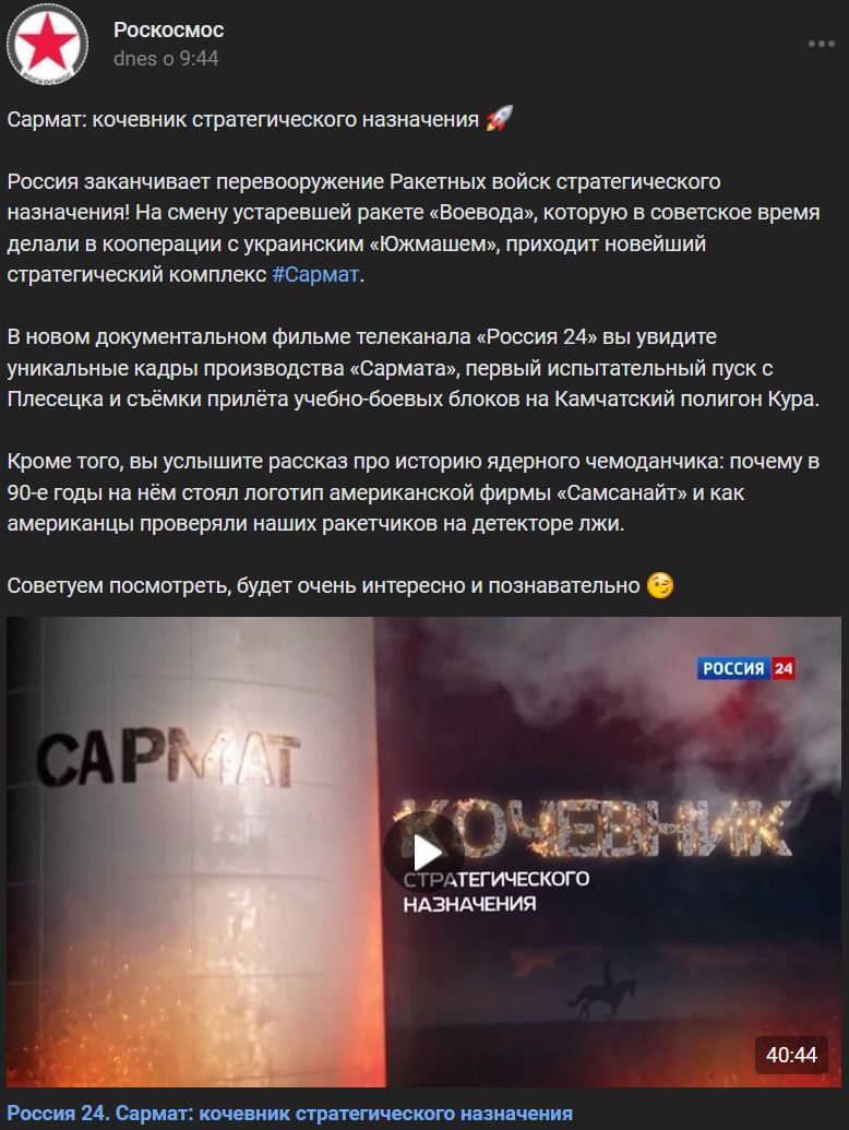 Rusko dokončuje prezbrojenie strategických raketových síl (RVSN). Zastarané rakety Vojevoda (Воевода), ktoré boli vyrobené v spolupráci s ukrajinským Južmašom počas sovietskej éry, nahradí najnovší strategický komplex Sarmat (Сармат). V novom dokumentárnom filme televízie Rossija 24 (Россия 24) uvidíte unikátne zábery z výroby Sarmatov, prvý skúšobný štart z Plesecka a zábery z príletu výcvikových blokov na polygón Kura (Кура) na Kamčatke. Okrem toho si vypočujete príbeh o histórii jadrového kufríka: prečo v 90. rokoch niesol logo americkej spoločnosti Samsonite a ako Američania kontrolovali našich raketových inžinierov na detektore lži. Odporúčame si ho pozrieť, bude veľmi zaujímavý a poučný