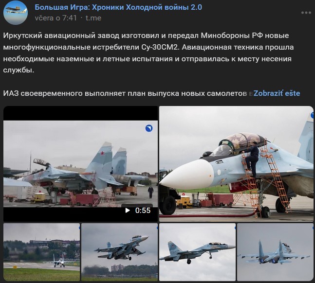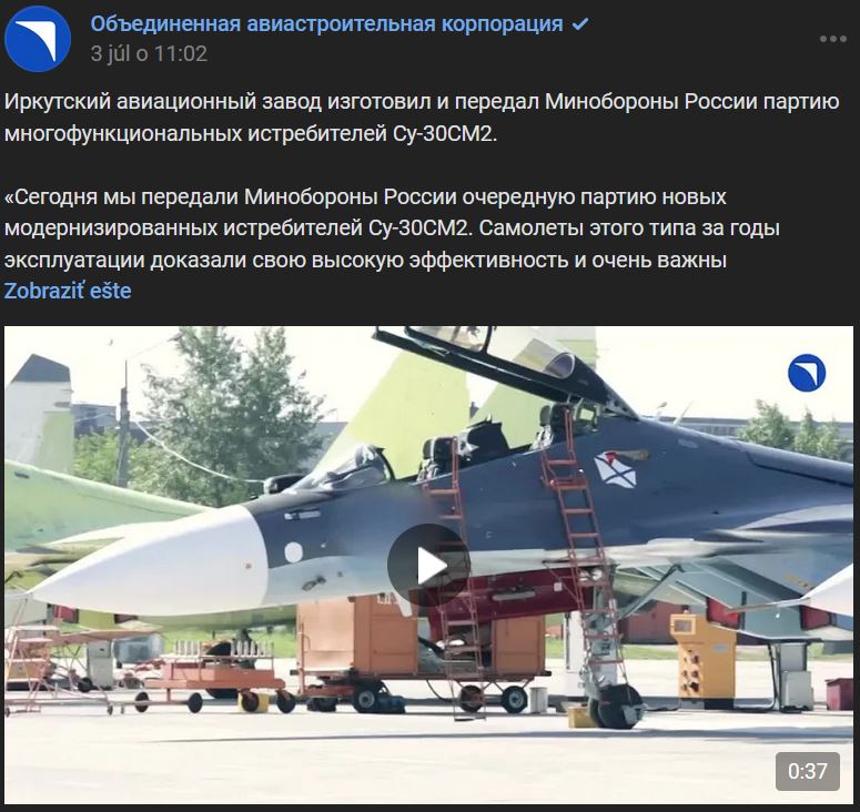 "V pondelok 03.07.2023 sme Ministerstvu obrany Ruska odovzdali ďalšiu sériu nových modernizovaných lietadiel Suchoj Su-30SM2 (Су-30СМ2). Lietadlá tohto typu sa za roky prevádzky ukázali ako vysoko efektívne a sú veľmi dôležité pre obranyschopnosť našej krajiny. Výroba lietadiel v rámci štátnej obrannej objednávky prebieha v Irkutskom závode na výrobu lietadiel OAK podľa plánu. Všetky lietadlá plánované na dodanie v tomto roku 2023 sú už v záverečnej montážnej dielni alebo v oddelení letových skúšok," uviedol prvý námestník generálneho riaditeľa štátnej korporácie Rostech (Ростех) Vladimir Artjakov (Владимир Артяков).