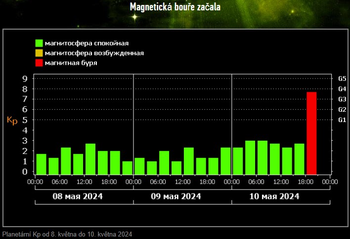 Stupeň poruchy magnetického pole Země za posledních 24 hodin dosáhl úrovně G4, což na pětibodové stupnici znamená velmi silný stupeň, zatímco G5 je extrémní úroveň a G1 je slabá.