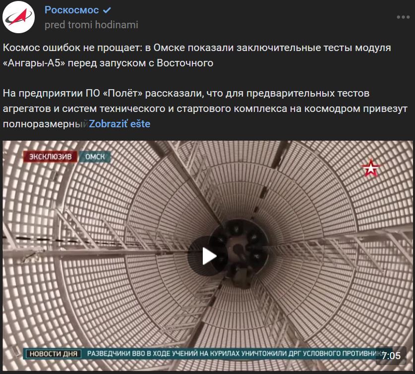 Spoločnosť PO Poljot (ПО Полёт) v meste Omsk uviedla, že na kozmodróm Vostočnyj bude privezená maketa modulu Angara v plnej veľkosti na predbežné testy jednotiek a systémov technického a štartovacieho komplexu. Posledný modul ťažkej nosnej rakety Angara-A5 (Ангара-А5) sa podrobuje záverečným skúškam na skúšobnom stende. Špecialisti už preverili činnosť palivových systémov a to, aké vibrácie raketa vydrží. Video https://vk.com/video-30315369_456243556 dĺžka 7:05 min.
