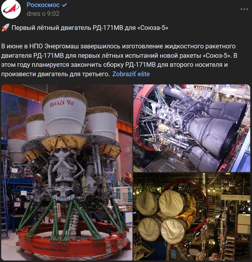 V 06/2023 NPO Energomaš (НПО Энергомаш) dokončila výrobu raketového motora RD-171MV (РД-171МВ) na kvapalné palivo pre prvé letové skúšky novej rakety Sojuz-5 (Союз-5). Tento rok 2023 sa plánuje dokončiť montáž RD-171MV pre druhú nosnú raketu a vyrobiť motor pre tretiu. Zmluva na program RD-171MV bola podpísaná v roku 2019, ale práce prebiehajú v predstihu už od leta 2017. Počas tohto obdobia bola vydaná a odsúhlasená konštrukčná (vrátane elektronickej) a technická dokumentácia, pripravila sa výroba na výrobu RD-171MV, vykonali sa autonómne skúšky motorových jednotiek, dielov a zostáv, vyrobila sa maketa na dynamické skúšky a motor na studené a "ohňové" stendové skúšky prvého stupňa rakety na stendoch v spoločnosti RKC Progress (РКЦ Прогресс). V NPO Energomaš (НПО Энергомаш) boli vyrobené, otestované a defektoskopicky skontrolované aj 2 motory RD-171MV, ktoré sa použijú na vývojové a záverečné vývojové skúšky. Doteraz sa uskutočnili viac ako 20 zážihových skúšok motora RD-171MV. Ďalšou etapou sú medzirezortné skúšky RD-171MV a sériové dodávky motorov pre Sojuz-5. Zdroj https://vk.com/wall-30315369_567469 z 23.06.2023 + kvalitnejšie foto