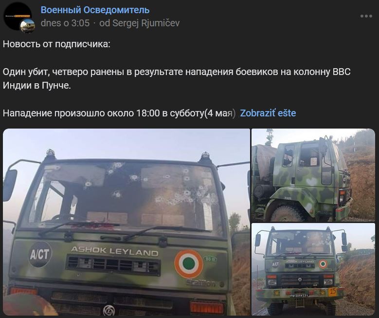 Zdroj https://vk.com/wall-123538639_4156875 z 06.05.2024Pri útoku militantov na konvoj indických vzdušných síl v Poonchu bol 1 príslušník zabitý a 4 zranení.