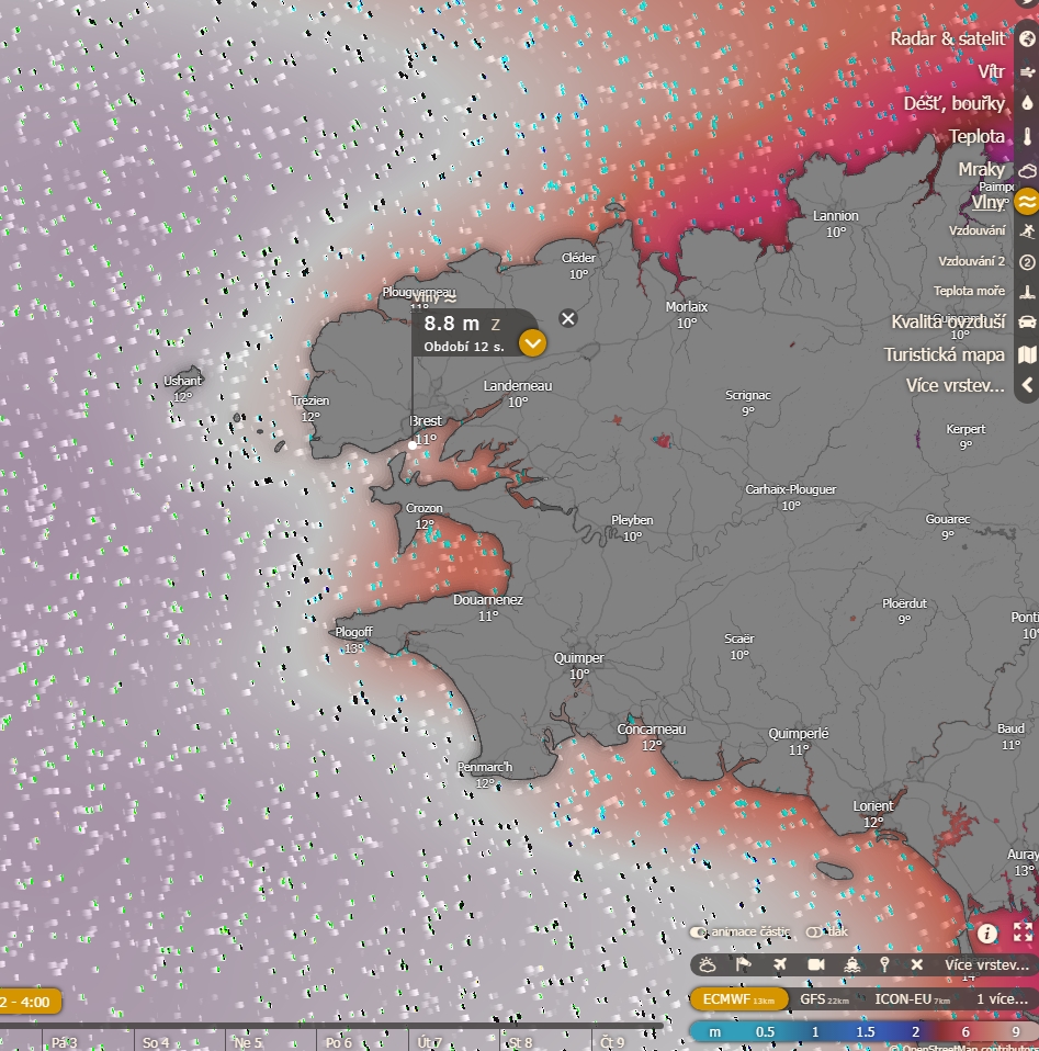 Proč? Protože VLNY. A pokud je na volném moři vlna 12m, na pobřeží to bude masakr. Chráněný bazén v Brestu bude mít co dělat, aby ty vlny ustál a nepustil je dále - podle předpovědi 8+ m. No uvidíme, nezávidím jim to...