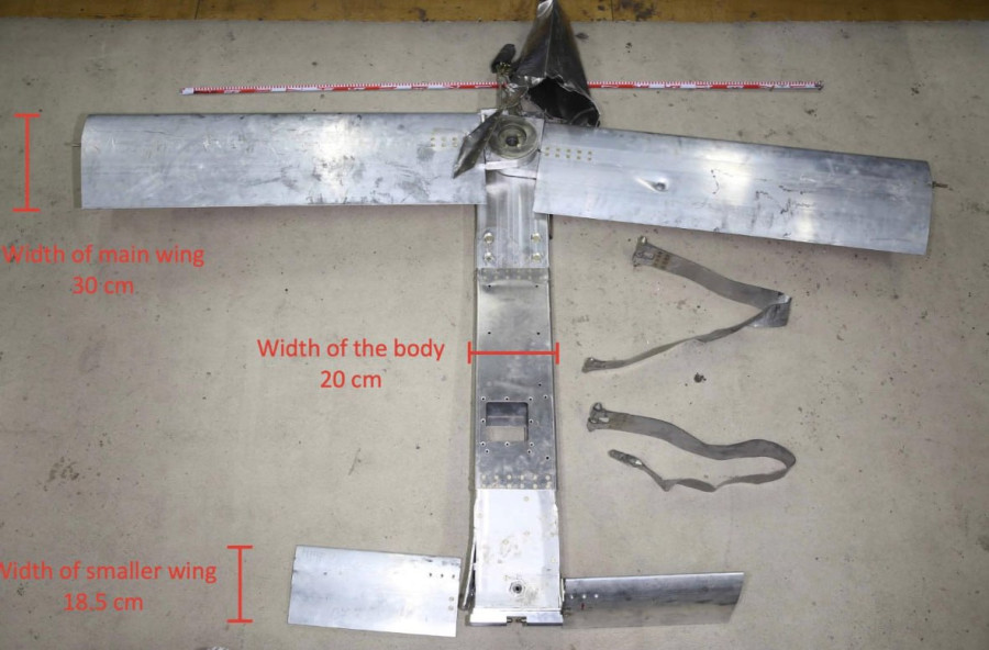 domácky vyrobená bomba pre dron - továrenský časový zapalovač pre ručné granáty UZRGM alebo varianta, hliníkové púzdro s trhacou náplňou (pravdepodobne nejaký plastik, 50-100g), továrenské hotové črepiny vyťažené "z niečoho", plastové telo s kovovou hlavou.