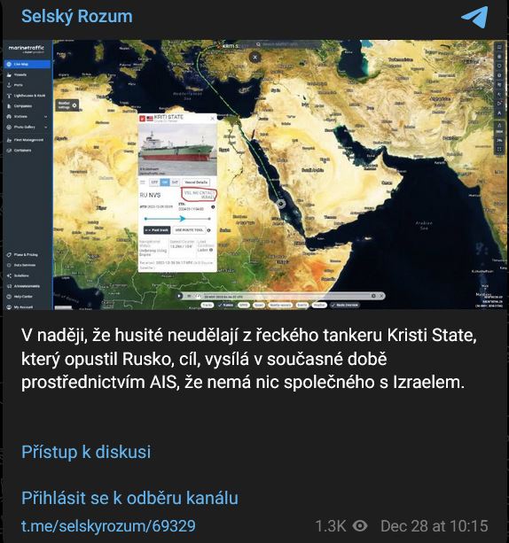 V naději, že husité neudělají z řeckého tankeru Kristi State, který opustil Rusko, cíl, vysílá v současné době prostřednictvím AIS, že nemá nic společného s Izraelem.