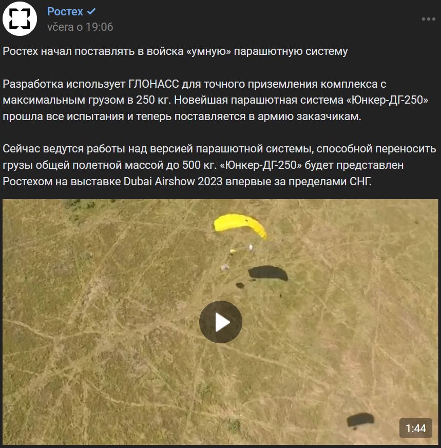Zariadenie využíva GLONASS (ГЛОНАСС) na presné pristátie systému s maximálnym zaťažením 250 kg. Najnovší padákový systém "Junker-DG-250" (Юнкер-ДГ-250) prešiel všetkými testami a teraz sa dodáva armáde k zákazníkom. V súčasnosti sa pracuje na verzii padákového systému, ktorý dokáže niesť náklad s celkovou letovou hmotnosťou do 500 kg. "Junker-DG-250" predstaví Rostech na Dubajskom leteckom veľtrhu 2023 po prvýkrát mimo územia SNŠ.