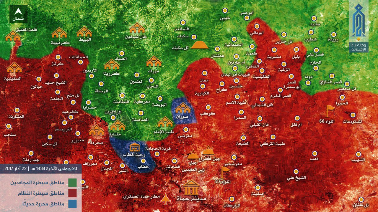 http://www.novarepublika.cz/2017/03/boj ... ozice.htmlPo měsíci napjatých jednání se zástupci Svobodného syrské armády dne 14. března Jabhat Fateh al-Sham, Harakat Ahrar al-Sham al-Islamiyya, kteří ovládali čtvrť Homsu Al-Waer během těžkých tří let podepsali mírovou dohodu s oficiálním Damaškem. Podle ní musí ozbrojená opozice stáhnout své vojáky k provincii Idlib.