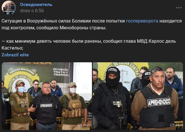 Zdroj: https://www.idnes.cz/zpravy/zahranicni ... nicni_vajoBolivijská armáda ve středu vstoupila do prezidentského paláce v metropoli La Paz. Prezident Luis Arce ji vyzval k opuštění sídla a apeloval na obyvatele, aby se postavili proti státnímu převratu. Armádní jednotky se později začaly stahovat a bolivijské úřady zadržely generála Juana Josého Zuňigu, který patrně stál v čele puče. Vyšetřuje ho prokuratura. Kontrolu nad náměstím, kam vjely i tanky, drží policie.