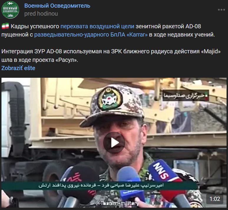 Zábery úspešného zachytenia vzdušného cieľa PVO raketou AD-08 vypustenou z prieskumno-bojového BPLA Karrar počas nedávneho cvičenia. Integrácia PVO rakety AD-08 používaný v PVO krátkeho dosahu "Majid" bola počas projektu "Rasul" (Расул). V nedeľu 22.10.2023 veliteľ síl PVO iránskej armády generál Alireza Sabahifard oznámil úspešnú realizáciu projektu "Rasul".
