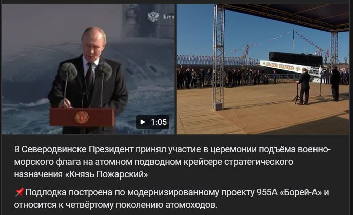 Video https://vk.com/video-123538639_456317842 dĺžka 1:05 min.V Severodvinsku (Северодвинске) sa Prezident zúčastnil na slávnostnom vztýčení námornej vlajky na strategickom ponorkovom krížniku na jadrový pohon "Kňaz Požarskij" (Князь Пожарский)
