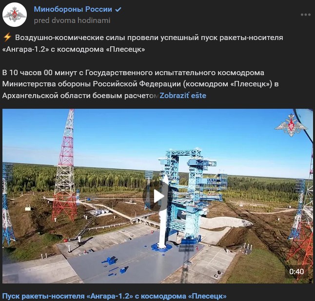 Vzdušno-kozmické sily úspešne vypustili nosnú raketu Angara-1.2 (Ангара-1.2) z kozmodrómu Pleseck (Плесецк)