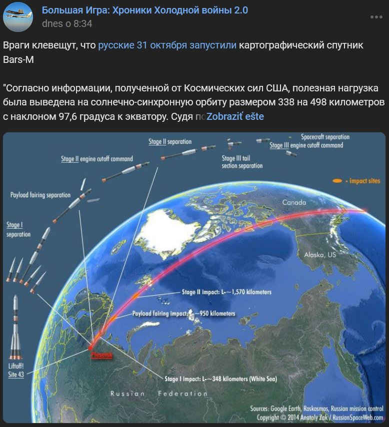 Nepriatelia klebetia, že Rusi vo štvrtok 31.10.2024 vypustili mapovací (kartografický) satelit Bars-M (Bars-M)