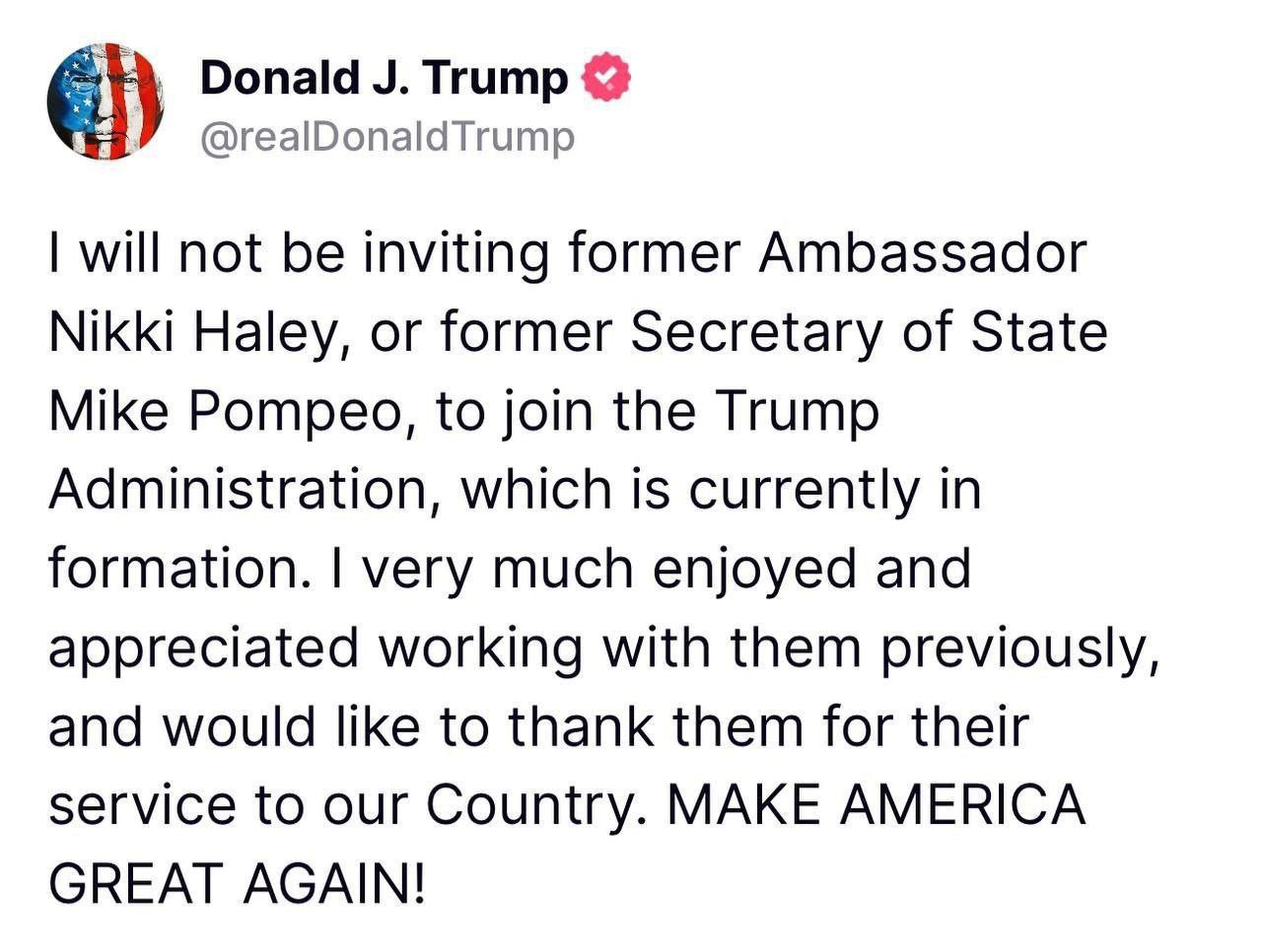 Trump ujistil, že bývalý ministr zahraničí Mike Pompeo ani bývalá velvyslankyně USA při OSN Nikki Haleyová v nové administrativě nebudou - poděkoval jim za spolupráci v minulosti.