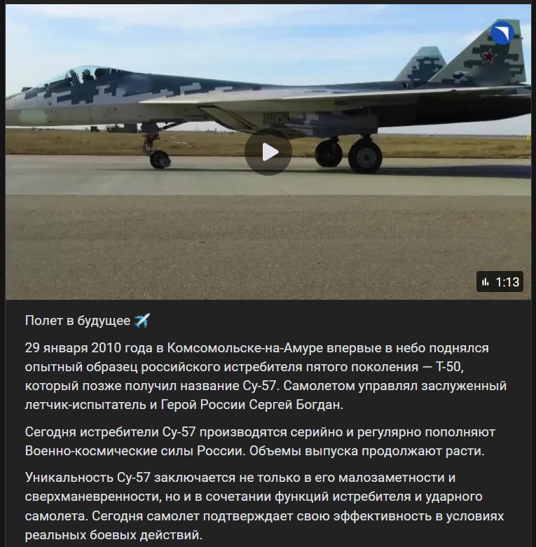 29.01.2010 = pred 15-timi rokmi v Komsomoľsku na Amure sa do vzduchu po prvýkrát vzniesol prototyp ruského stíhacieho lietadla 5. generácie T-50, neskôr nazvaného Suchoj Su-57 (Су-57). Lietadlo pilotoval zaslúžili skúšobný pilot a Hrdina Ruska Sergej Bogdan (Сергей Богдан). Dnes sa lietadlá Suchoj Su-57 vyrábajú sériovo a pravidelne sa zaraďujú do ruských vojensko-kozmických síl. Objem výroby naďalej rastie. Jedinečnosť Su-57 spočíva nielen v jeho nízkej zistiteľnosti a supermanévrovateľnosti, ale aj v kombinácii funkcií stíhacieho a bojového lietadla. V súčasnosti lietadlo potvrdzuje svoju účinnosť v reálnych bojových operáciách.