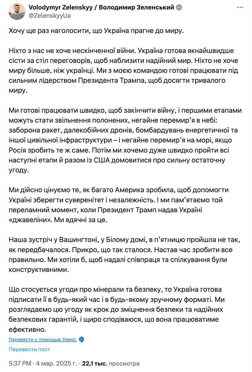 "Naše páteční setkání v Bílém domě neproběhlo tak, jak mělo. Mrzí mě, že se to stalo. Je čas věci napravit," napsal Zelenskyj a dodal, že je připraven pracovat pod "silným vedením prezidenta Trumpa" na dosažení míru na Ukrajině.