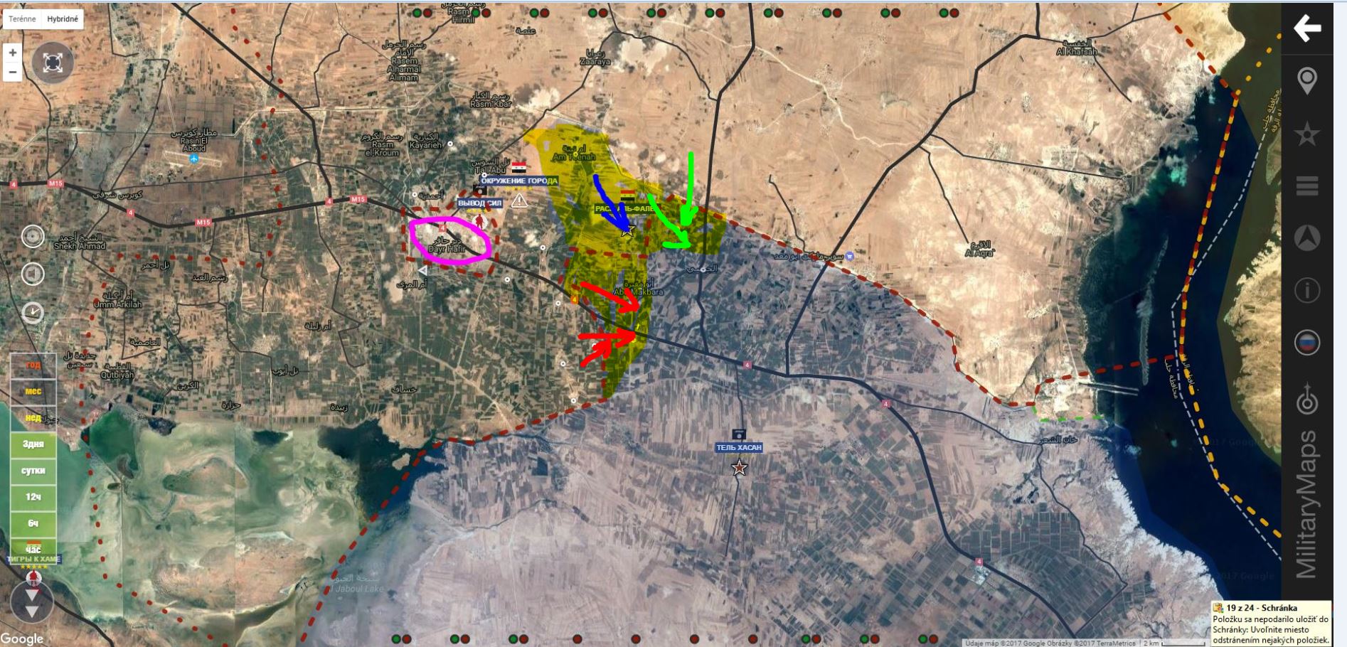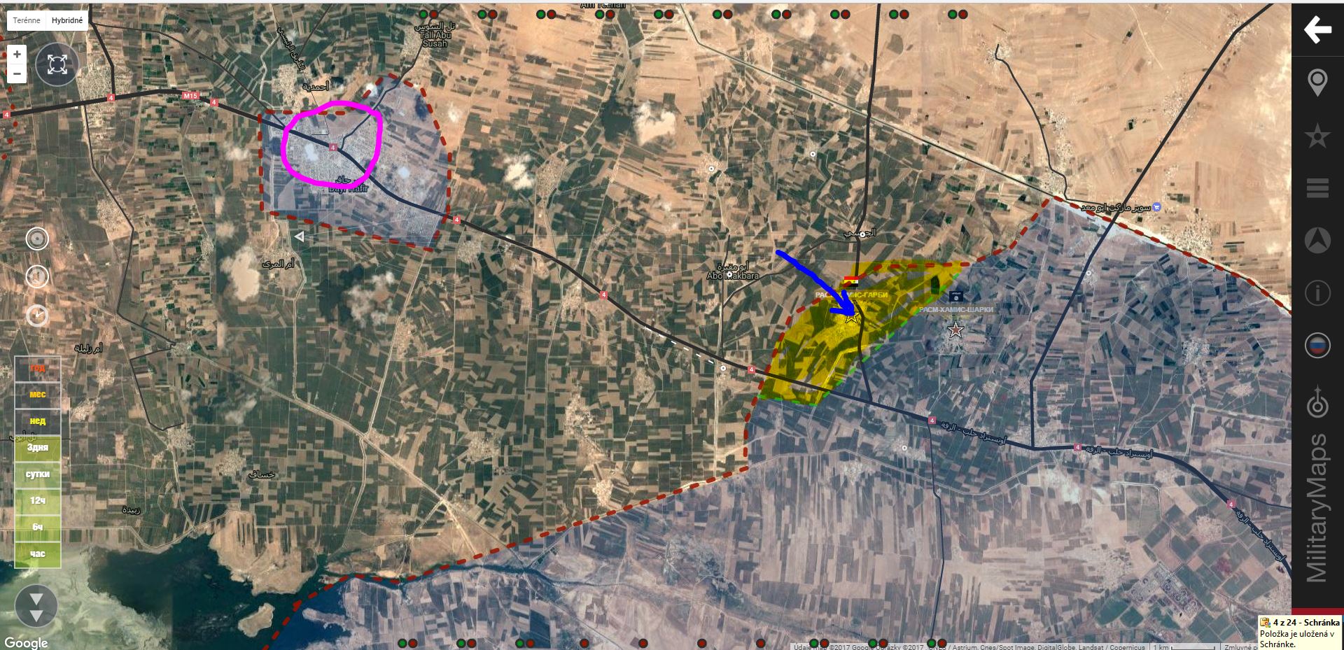 Dnešná situácia. SDF + získali Sahl al-Khashab a Uwayj Wedyan, podľa by mali ovládať aj Ayad Khabir