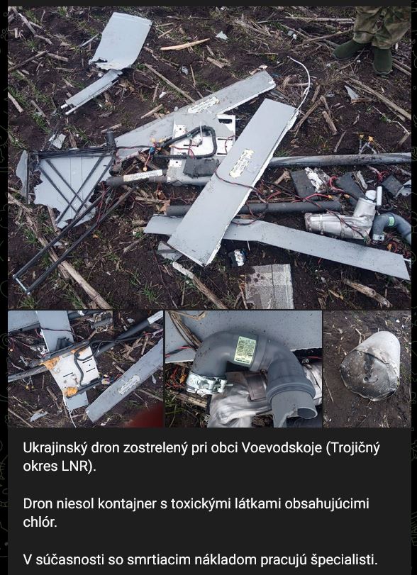 Zdroj https://t.me/casusbellilive/204302 / https://t.me/voenkorKotenok/62888 z 15.03.2025Ukrajinský dron zostrelený pri obci Voevodskoje (Trojičný okres LNR). Dron niesol kontajner s toxickými látkami obsahujúcimi chlór. V súčasnosti so smrtiacim nákladom pracujú špecialisti.