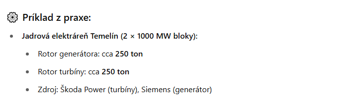 Bavili sme sa tu nedávno o schopnosti rotujúcej turbíny a generátora elektrárne stabilizovať svojím momentom zotrvačnosti frekvenciu v sieti. Tak som sa opýtal AI a toto mi odpovedala. V podstate to dá impulzný výkon 307MW po dobu 0,1sec(ak sa znížia otáčky z 1500 na 1491ot/min) Hmotnost rotujúcich častí je vraj 500 ton :shock: .