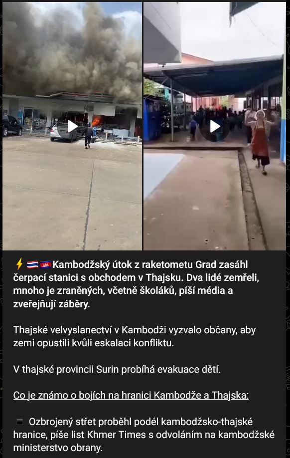 Kambodžský útok z raketometu Grad zasáhl čerpací stanici s obchodem v Thajsku. 2 lidé zemřeli, mnoho je zraněných, včetně školáků, píší média a zveřejňují záběry