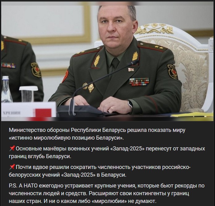 Hlavné manévre vojenského cvičenia „Zapad-2025“ (Запад-2025) sa presunú od západných hraníc do vnútrozemia Bieloruska. Takmer o 1/2 sa zníži počet účastníkov rusko-bieloruských cvičení „Západ-2025“ v Bielorusku.