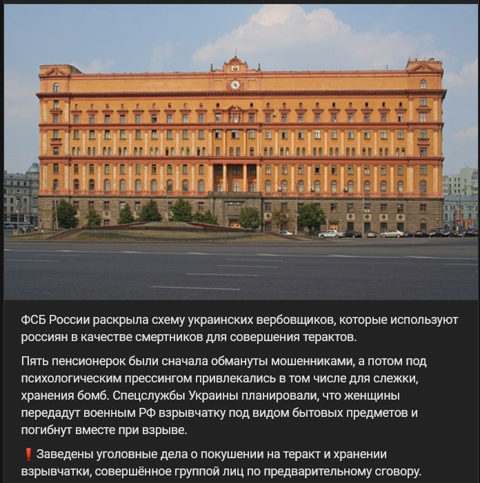 5 dôchodkýň bolo najprv oklamaných podvodníkmi a potom boli pod psychologickým nátlakom naverbované okrem iného na sledovanie a skladovanie bômb. Ukrajinské špeciálne služby plánovali, že ženy odovzdajú príslušníkom RF výbušninu pod zámienkou predmetov dennej potreby a spoločne s nimi zahynú pri výbuchu.