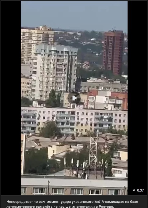 Priamy moment nárazu ukrajinského BPLA-kamikadze na báze ľahkého motorového lietadla do strechy výškového domu v Rostove.