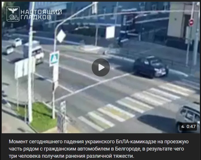 Moment dnešného dopadu ukrajinského BPLA-kamikadze na vozovku s civilným vozidlom v Belgorode, v dôsledku čoho utrpeli 3 ľudia zranenia rôznej závažnosti.