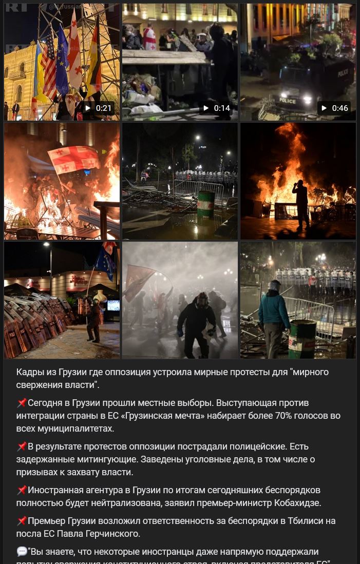 „Žiaľ, prebiehal paralelný protest zameraný na zvrhnutie vlády a verejnosť bola svedkom vandalizmu a výziev... V Gruzínsku stále pôsobia sily pod kontrolou zahraničných spravodajských služieb. Gruzínsky ľud nedovolí nikomu zmeniť moc silou... V tejto krajine sa vedenie dá zmeniť iba prostredníctvom volieb,“ povedal Kavelašvili.