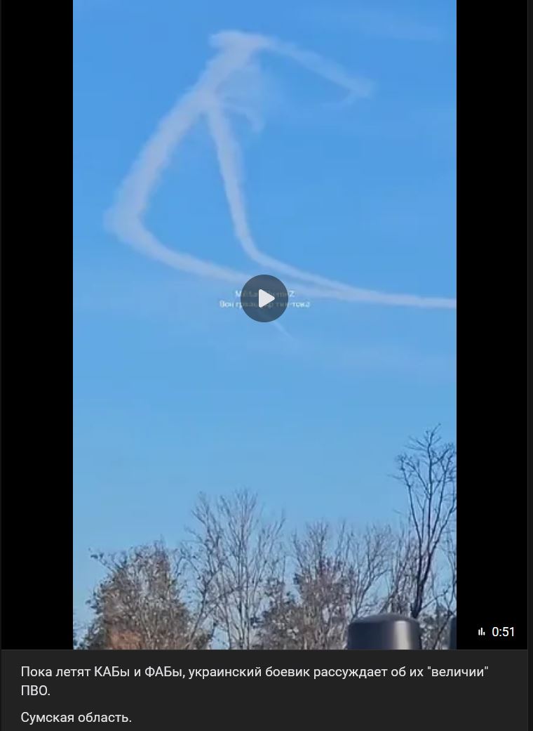 Video https://vk.com/video-104764077_456289790 dĺžka 51 sek.Zatiaľ čo lietajú KABy (КАБ) a FABy (ФАБ), ukrajinský bojovník uvažuje o ich „veľkosti“ protivzdušnej obrany (PVO).
