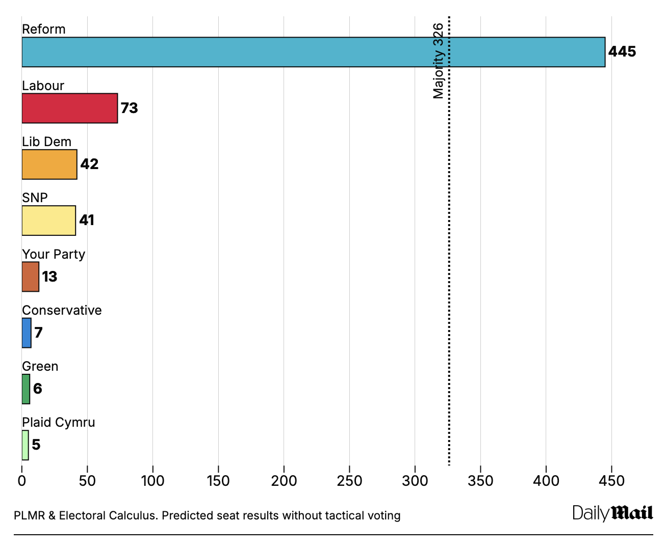 Nigel Farage by podľa výbušného megaprieskumu verejnej mienky suverénne ovládol Dolnú snemovňu britského parlamentu. Reform UK by v prípade konania parlamentných volieb získala 445 kresiel zo 650, labouristi len 73 a konzervatívci iba 7 kresiel. Prieskum uskutočnila komunikačná spoločnosť PLMR v spolupráci s Electoral Calculus. Podľa prognózy liberálni demokrati by získali 42 kresiel, Škótska národná strana (SNP) 41 a strana Jeremyho Corbyna 13, Zelení by mali 6 a Waleská strana 5.