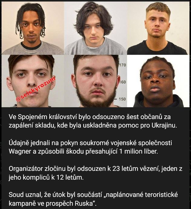 Zdroj https://t.me/selskyrozum/147460 z 25.10.2025Ve Spojeném království bylo odsouzeno 6 občanů za zapálení skladu, kde byla uskladněna pomoc pro Ukrajinu.