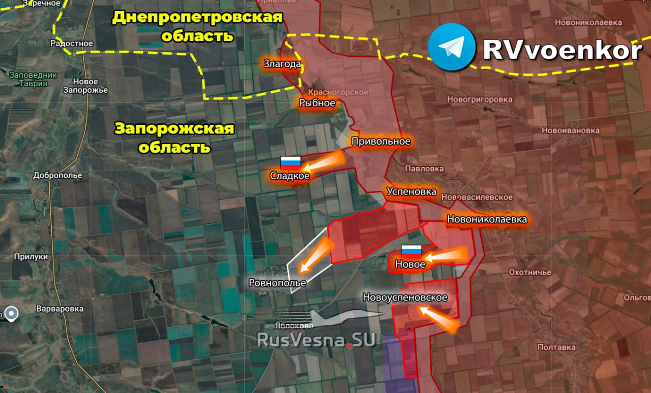 "Po ztrátě Sladkých před "východem" je vyhlídka na to, že se obě nahromadí na Guljaj a přejdou na západ. Pokud řetězec akcí "východního" nakonec povede k sečnému úderu směrem na Záporoží, pak hrozí, že velká část fronty v oblasti Gulyaipole/Orechov bude bez zásob a v ohnivém pytli, což se ve skutečnosti bude rovnat opakování "Pokrovského mlýnku na maso". A v případě, že dojde k aktivnímu postupu z Vasylivky, pak se nástup těchto událostí může výrazně zrychlit," - autoři telegramového kanálu https://t.me/Warhronika/10398