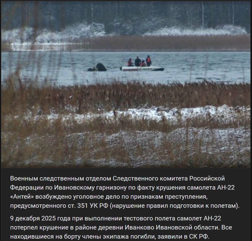 Zdroj https://vk.com/wall-123538639_4761358 z 09.12.2025Vojenské vyšetrovacie oddelenie Vyšetrovacieho výboru Ruskej federácie pre Ivanovský garnizón začalo trestné stíhanie vo veci havárie lietadla Antonov An-22 „Antej“ (Антей) na základe znakov trestného činu podľa § 351 Trestného zákonníka Ruskej federácie (porušenie pravidiel prípravy na lety).