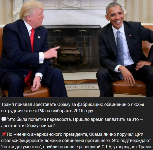 Podľa amerického prezidenta, Obama osobne poveril CIA (ЦРУ), aby sfalšovala falošné obvinenia proti nemu. Potvrdzujú to „stovky dokumentov“ zverejnených americkou spravodajskou službou, tvrdí Trump.