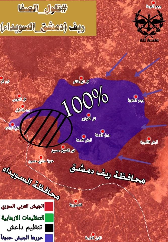 Sýrska arabská armáda (SAA) dnes obnovila svoju rozsiahlu ofenzívu v regióne Al-Safa v južnej Sýrii, po krátkom prerušení kvôli počasiu. Zdroj dodal, že sýrska arabská armáda zabila viac ako 20 militantov Daeshu a zničila množstvo ich technických vozidiel. Mala sa dostať k cintorínu v Sheik Hussein.