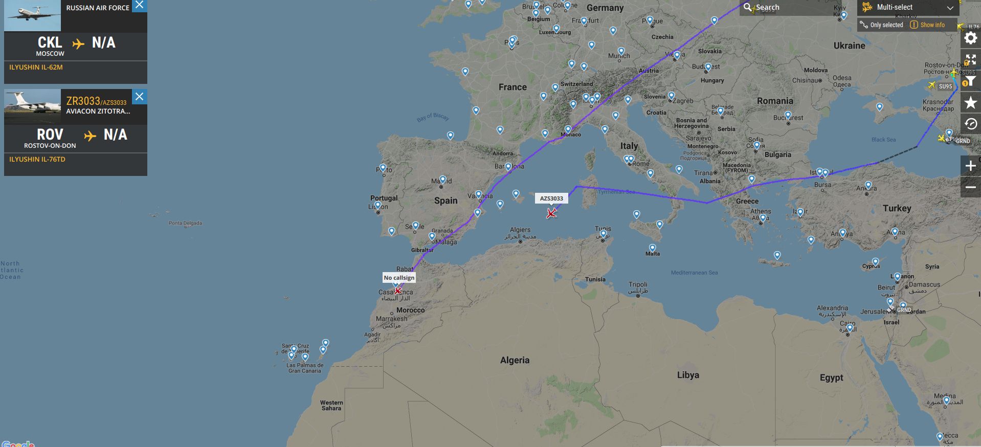Il-62M ruského letectva letící z Čkalovského nejspíše do Venezuely s mezipřistáním někde v Africe (Casablanca nebo Dakar) - už je nad Marokem, ten civilní Il-76TD za ním je asi jen náhoda :)