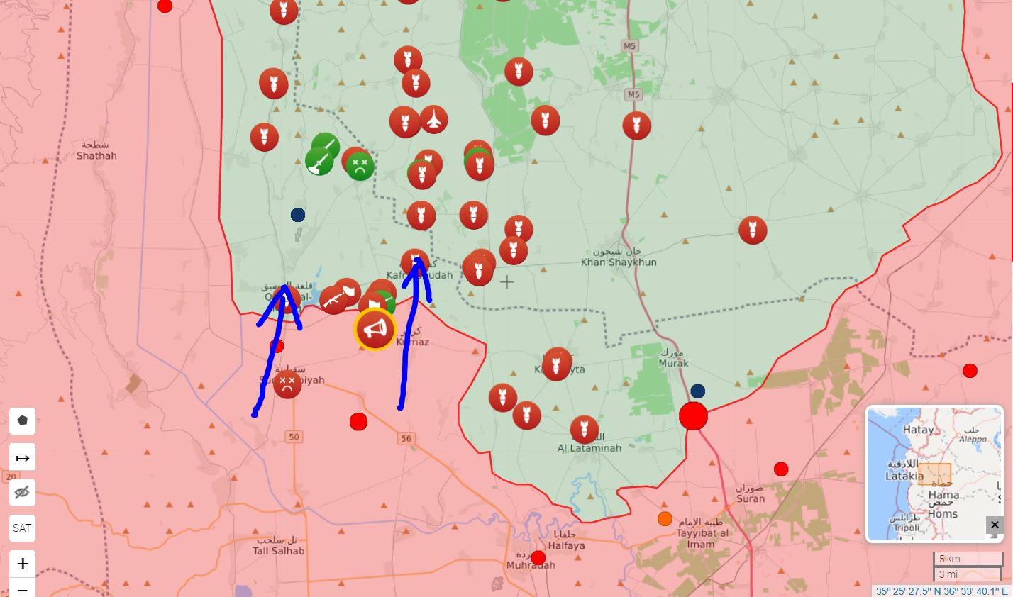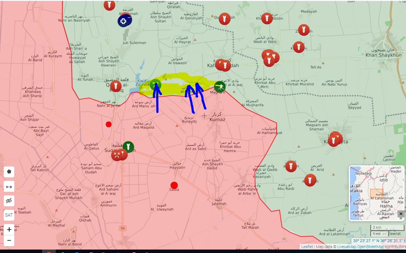 Sýrska arabská armáda pod vedením Tigrích síl zaútočila na niekoľko bodov pod kontrolou Jaysha Al-Izzu a Hay'ata Tahrira Al-Shama v blízkosti križovatky Abu Dhuhour v južnom Idlibe. V súčasnosti útočí na džihádistickú obranu blízko Qal'at Al-Madiq a Kafr Naboudeh.