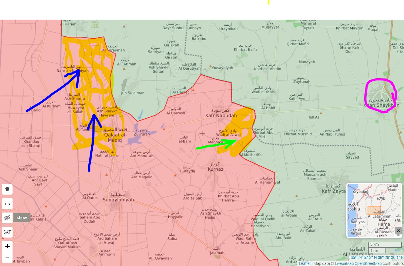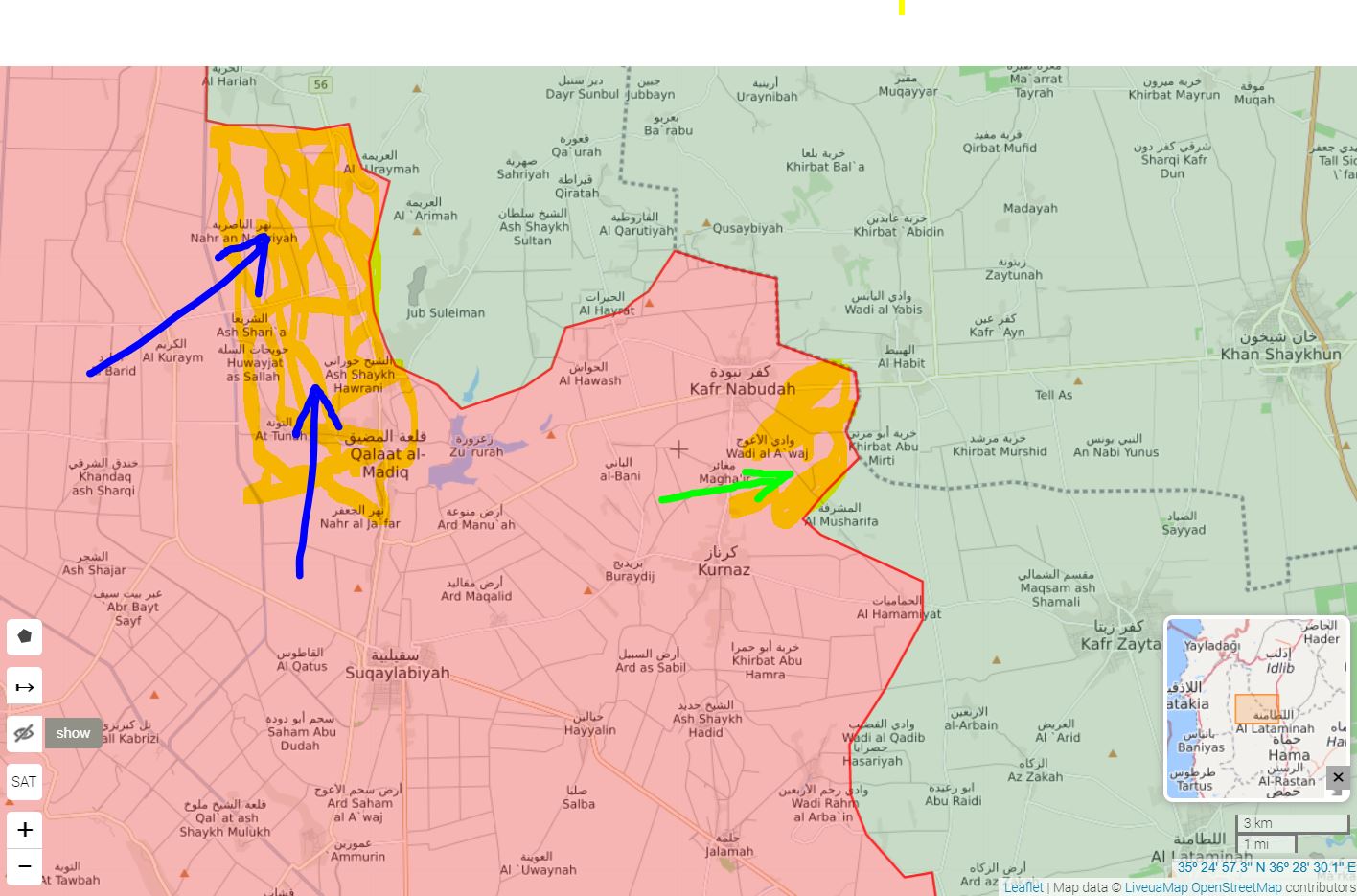 SAA+ ovláda Tal Hawash, Tal al-Sakhr a jeho farmy a mesto Al-Tuwainah a Shariah, severozápadne od Hama.